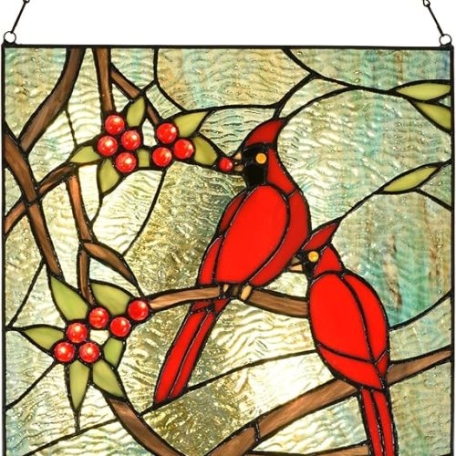 - DESIGN- This stained glass red cardinals,feathers brightly colored red, sitting on the branches with vibrant red berries of holly tree, seemed to be wating for someone? The panel sizes in W 12″x H 12″ and a L 26″ black metal chain included.When the sun shines through the window, Cardinal ornaments reflects colorful colors.
