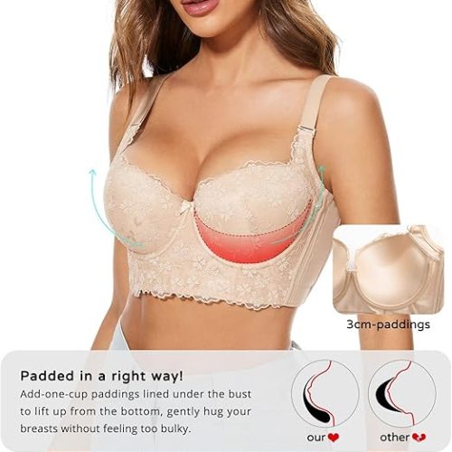- Lace bustier bra with add-one-cup-size padding offers extra volumes in the cups to enhance your cleavage and outline a nice shape.